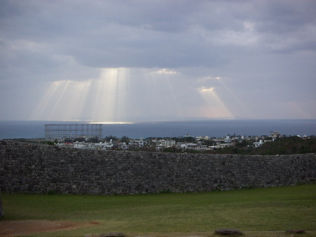 今度は、言葉を失った。近くの残波岬、さらにその周囲の東シナ海を一望することが出来たのだ。海の上には雲がかかり、その雲の切れ目から、西日の柔らかな光が水面へと注いでいる。それは、あたかも人知の及ばない何かが、天から降臨してくるかのような、そんな風景であった。沖縄には「ニライカナイ」という言葉がある。海の彼方にあると信じられている、神が住む楽土のことだ。石垣を上り突如表れた光景は、あまりに胸にすとんと落ちてきて、思わず「ニライカナイ」伝承を思い出した。